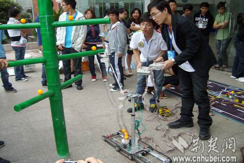 图为:学生现场展示自动摘果机